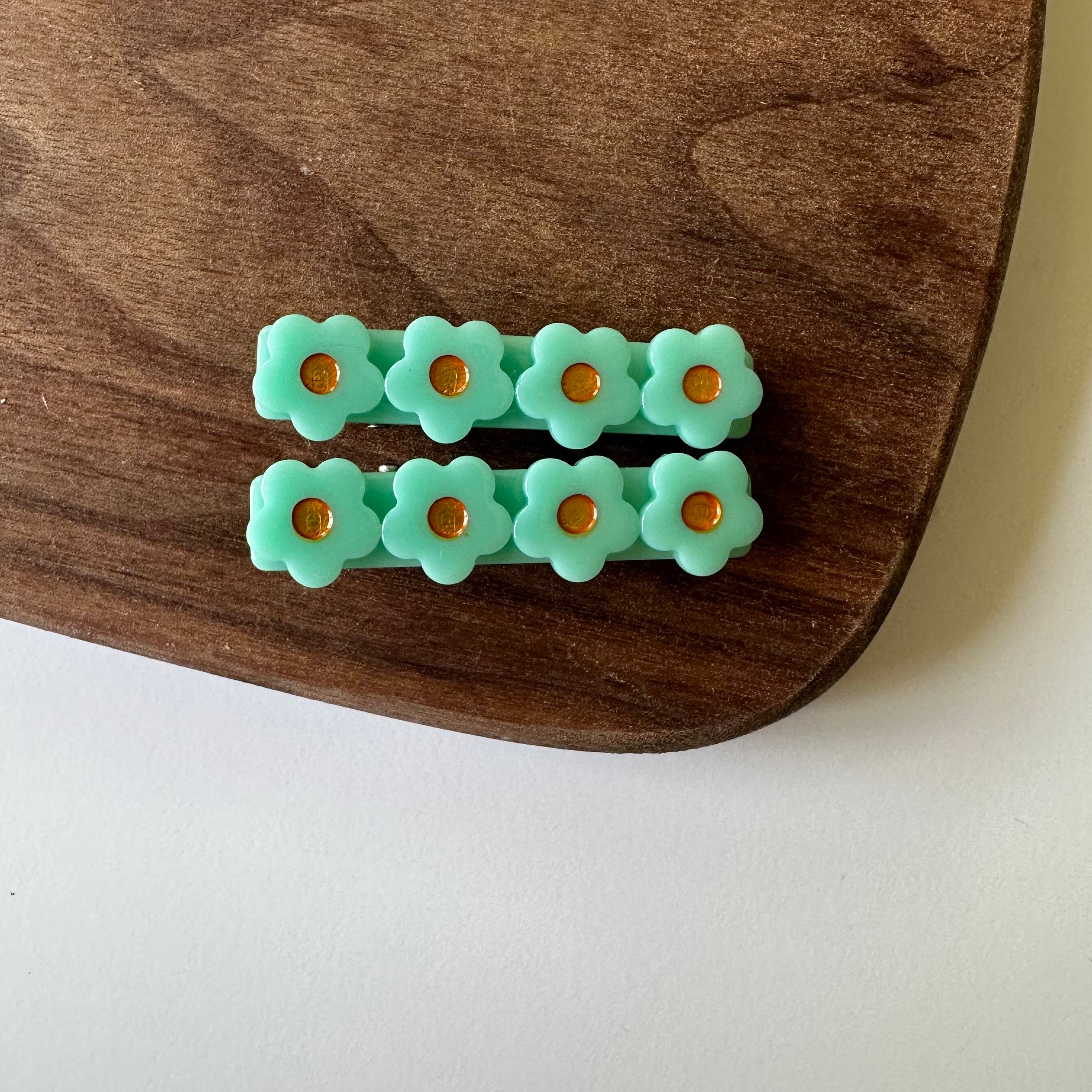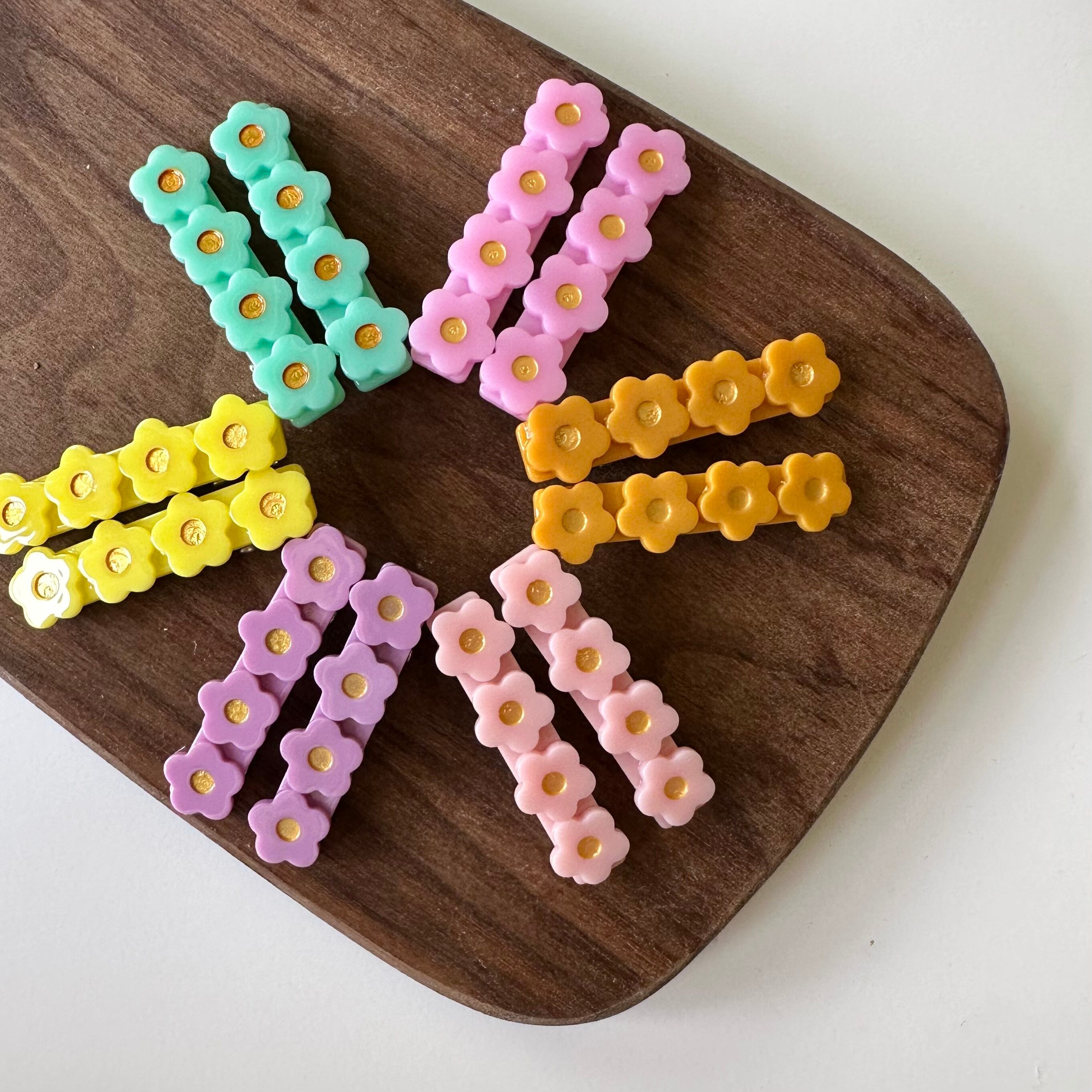 ■商品説明 フラワーモチーフクリップ、お子様の伸びかけた前髪に留めたりなど、様々なヘアアレンジで活躍してるアイテムです。