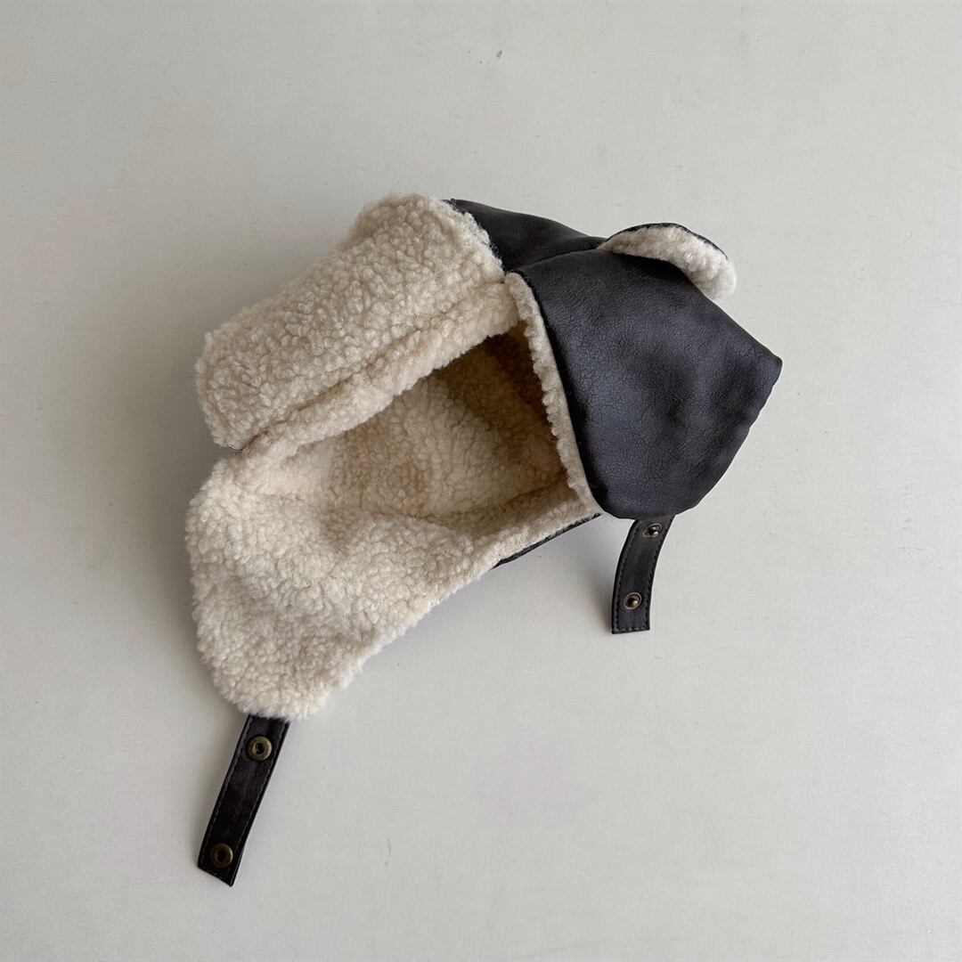 ■商品説明 被るだけでワンランク上のおしゃれな雰囲気を演出できるフェイクレザーフライトキャップ。裏部分がボア素材になっているので、寒い日の外遊びにおすすめ。